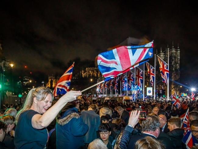 Jubilation in Parliament Square at the end of January 2020 as Britain finally leaves the EU. Photo Alexey Federenko/shutterstock.com.