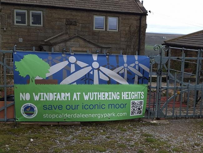One of many banners around Haworth campaigning against the proposed Calderdale Energy Park – a huge wind farm – which would wreck the famous moorland landscape. Photo Workers.